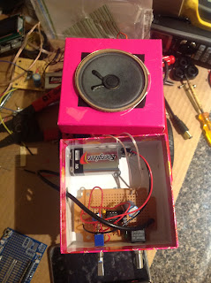 I used the same circuit, but made some design adjustments to the casing and the speaker choice.  At first I used a speaker that I ripped out of an old telephone, but it overloaded in about 30 seconds.  So instead, I used a 2.5 inch, 8 ohm speaker from You-Do-It Electronics, which ran me about $2.  I also found a pretty good looking box for my circuit lying around the house.  Here is the first edition of the assembly: